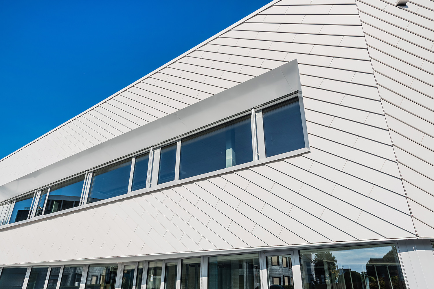 Die besondere Geometrie dieses Gebäudes und die damit überspitzte Interpretierung der fehlenden rechten Winkel wurde auch in die Fassade übertragen. Nicht nur, dass die Keramik in einem 35° Winkel verlegt wurde. Die 3 zur Strasse orientierten Fassaden wurden auch noch überhängend ausgeführt. Für die Fenstereinfassungen wurde das Konzept sogar auf die Spitze getrieben. Kein Winkel der Leibungen, Stürze und Fensterbänke kommt zweimal vor.