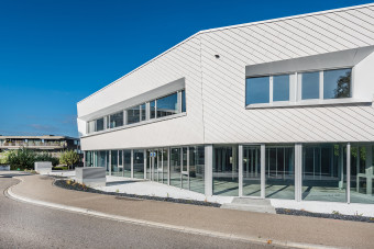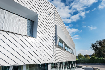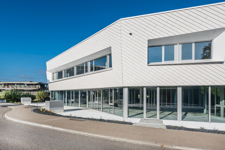 Die PV-Fassade ist mit einer Distanzschraubenlösung mit vertikal laufenden Aluminiumprofilen, durch das vorgehängte Waschbetonelemente in das hintere Tragwerk verankert worden. Jedes dieser Profile wurde zusätzlich mit einer Absturzsicherung versehen. Die PV-Module wurden mit dem Bewährenden System CM1 Solar verdeckt eingehängt.